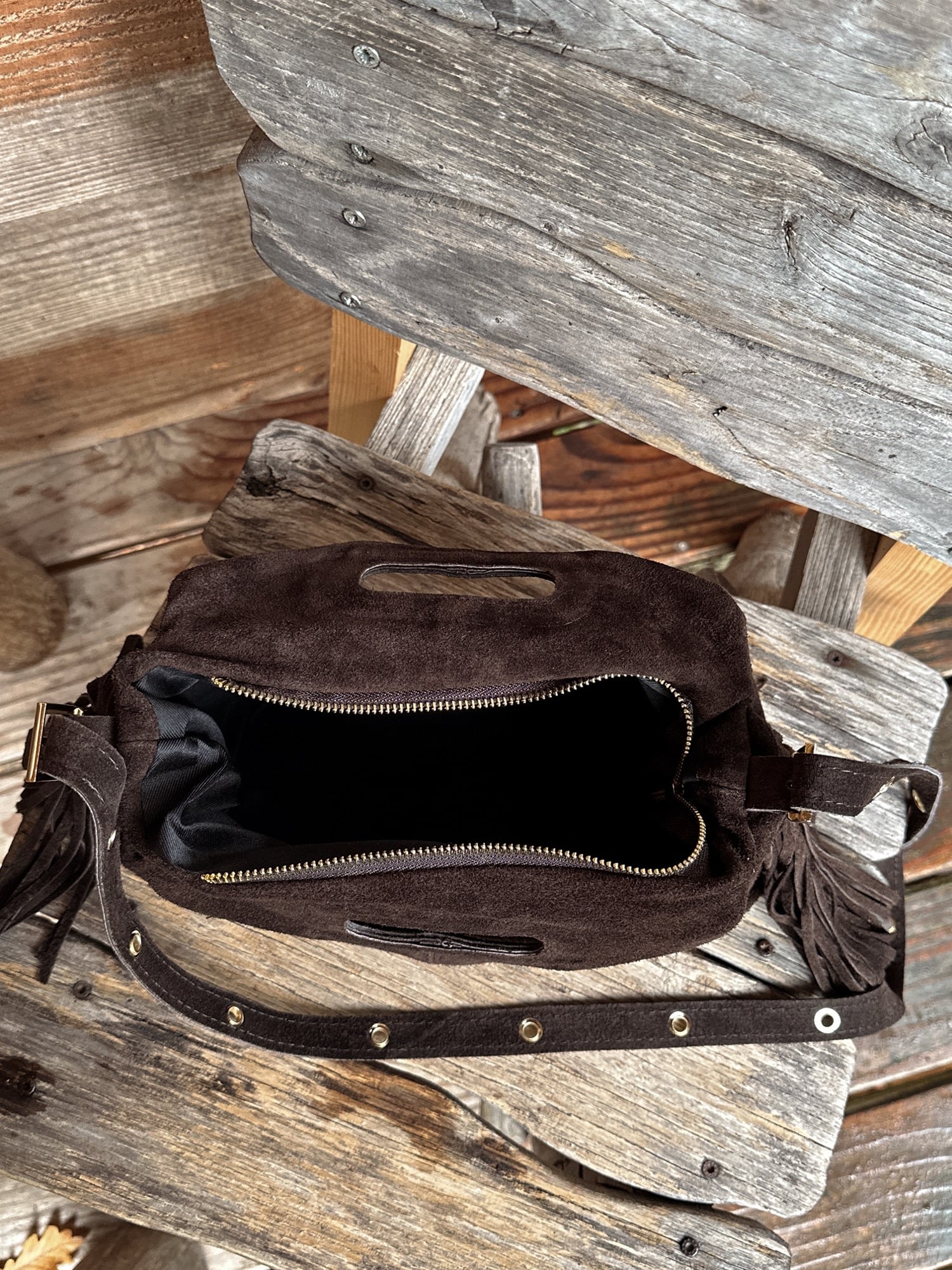 This fringed suede bag is the perfect companion for an everyday bohemian chic look. We love its velvety texture, easy to match with any seasonal outfit. Its cut-out handles and studded shoulder strap give it a modern Western feel, while the bangs add movement and character. Compact yet roomy enough for the essentials, it combines style and practicality. A must-have accessory that enhances any silhouette with an assumed folk touch.