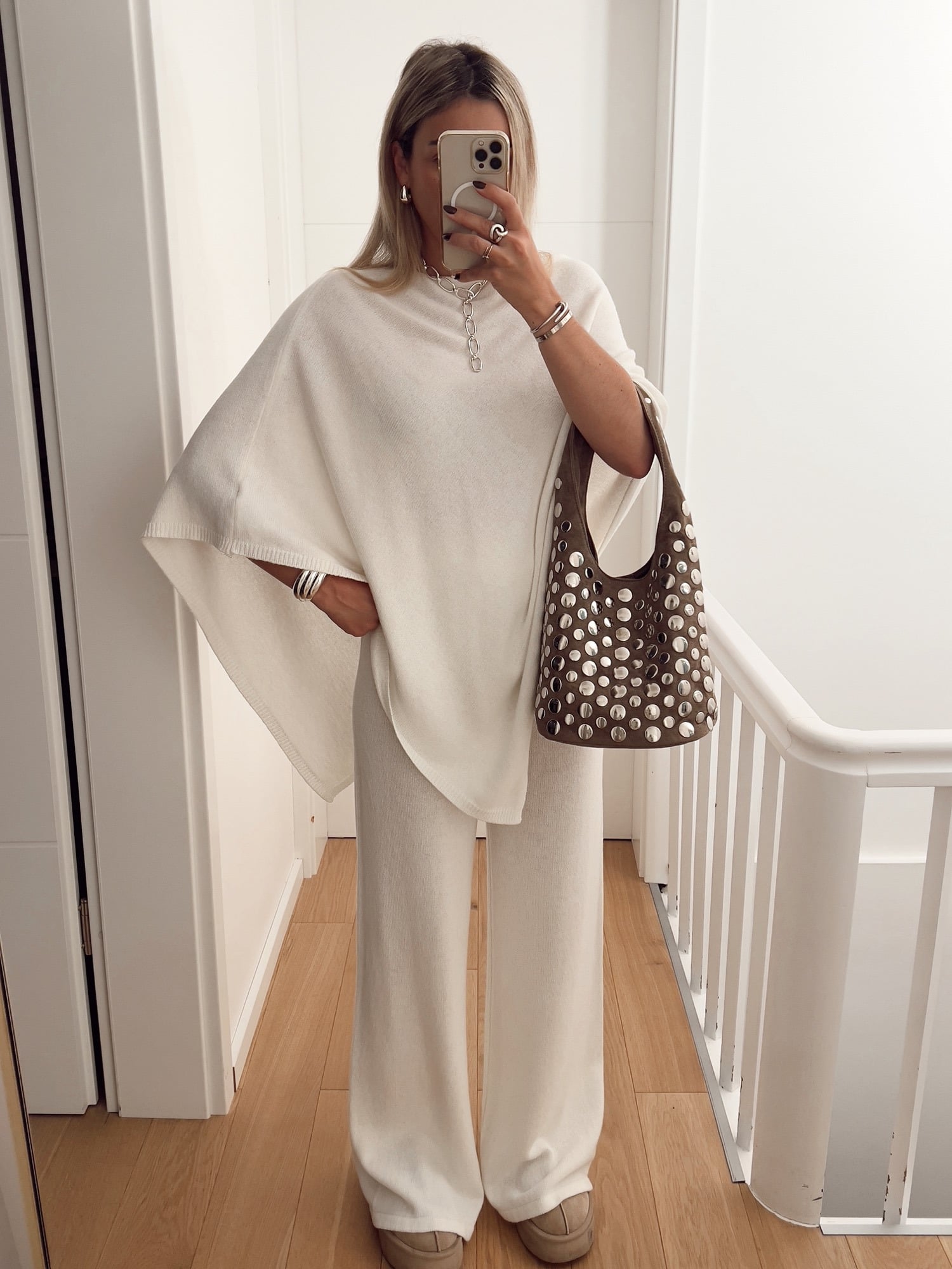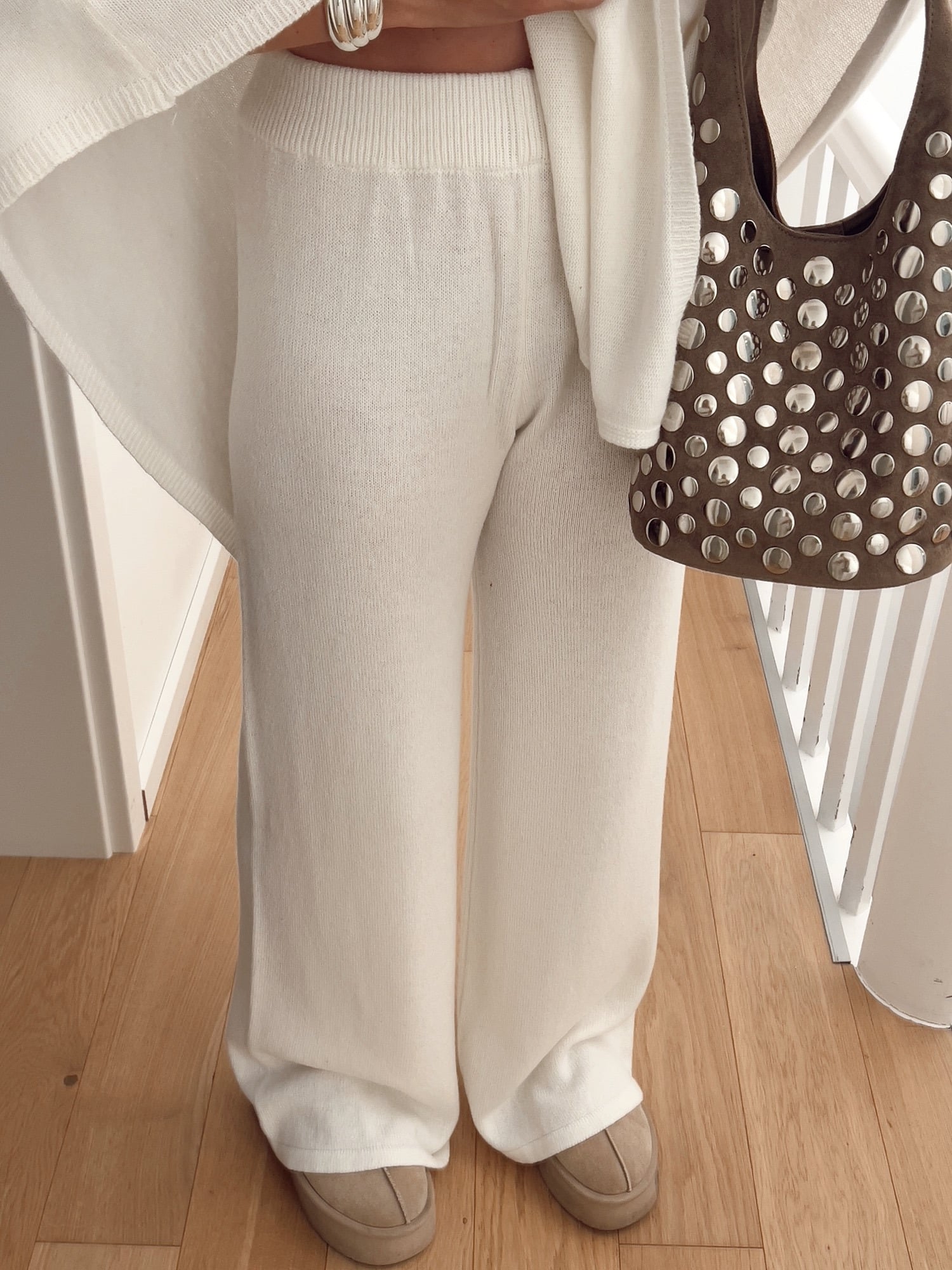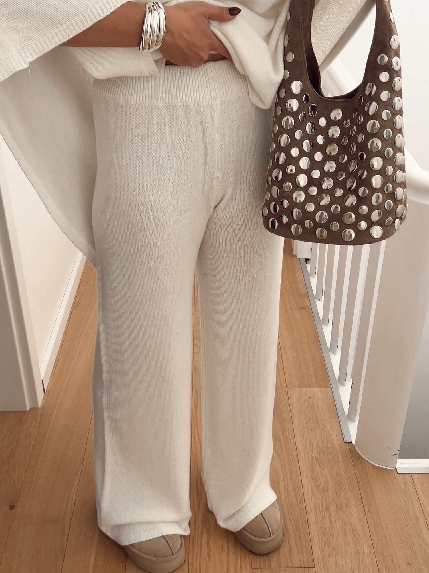 These knit pants combine absolute comfort with minimalist elegance. Their loose, flowing cut offers ideal freedom of movement, while their natural fall elongates the silhouette. Crafted in soft, luxurious cashmere, they provide the perfect cocooning sensation for chilly days. Its elasticated waistband ensures a comfortable fit, while its sober, refined style means it can be paired with a coordinating knit sweater or a dressier shirt. A must-have for a chic and cozy wardrobe.