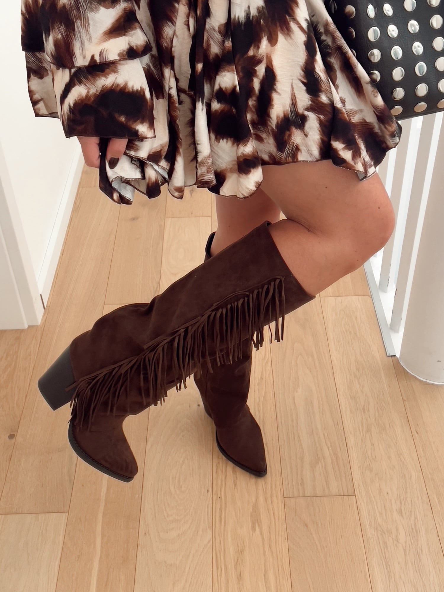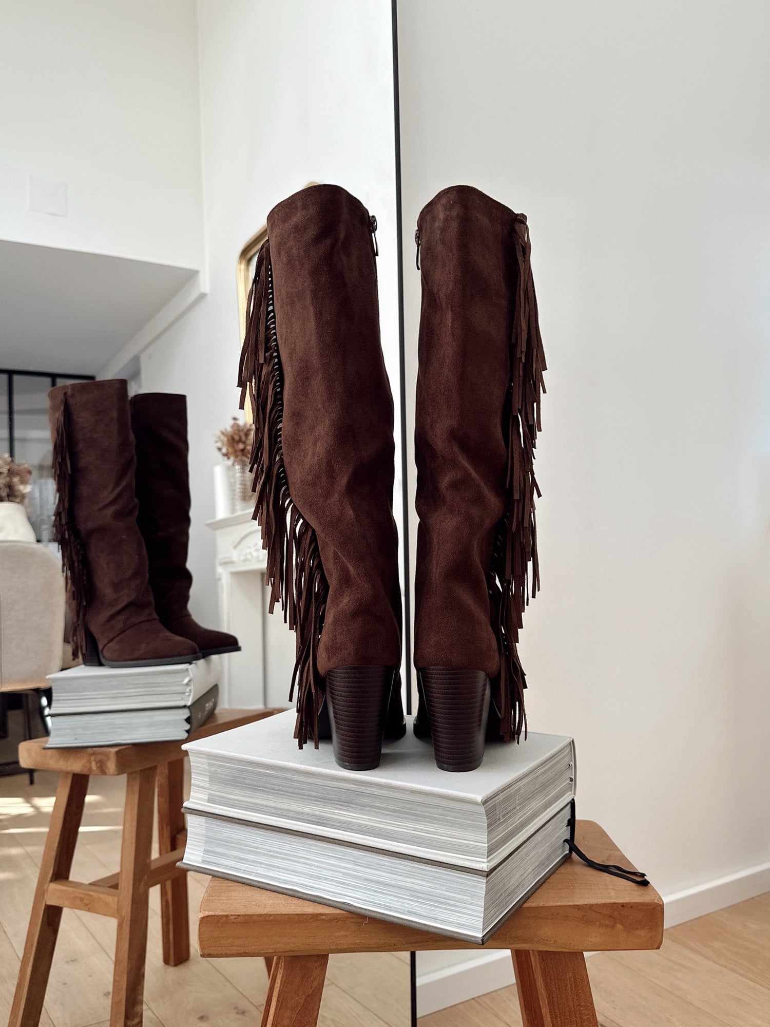 This pair of suede santiags combines elegance and character with an assertive bohemian touch. The design features side bangs that move fluidly with your every step. The pointed toe emphasizes timeless Western style, while the high cut slims and elongates the silhouette. The mid-block heel strikes the perfect balance between comfort and style. Wear these boots with a flowing dress or fitted jeans for a trendy, statement look.