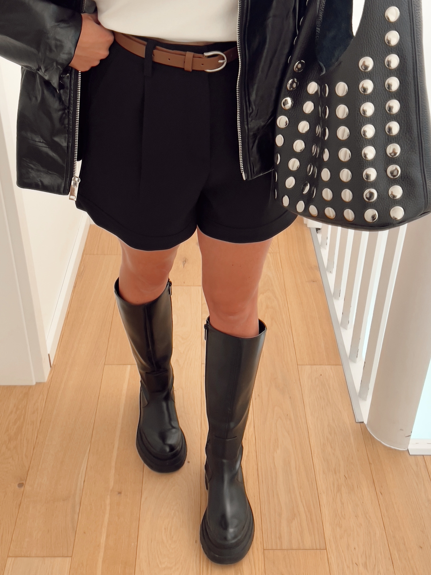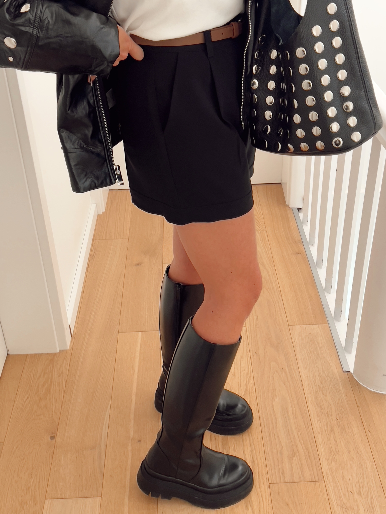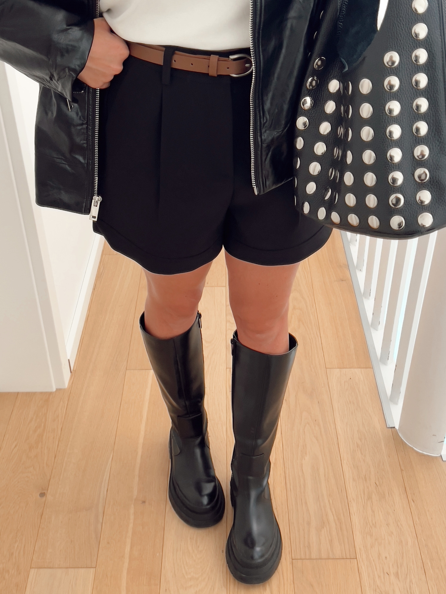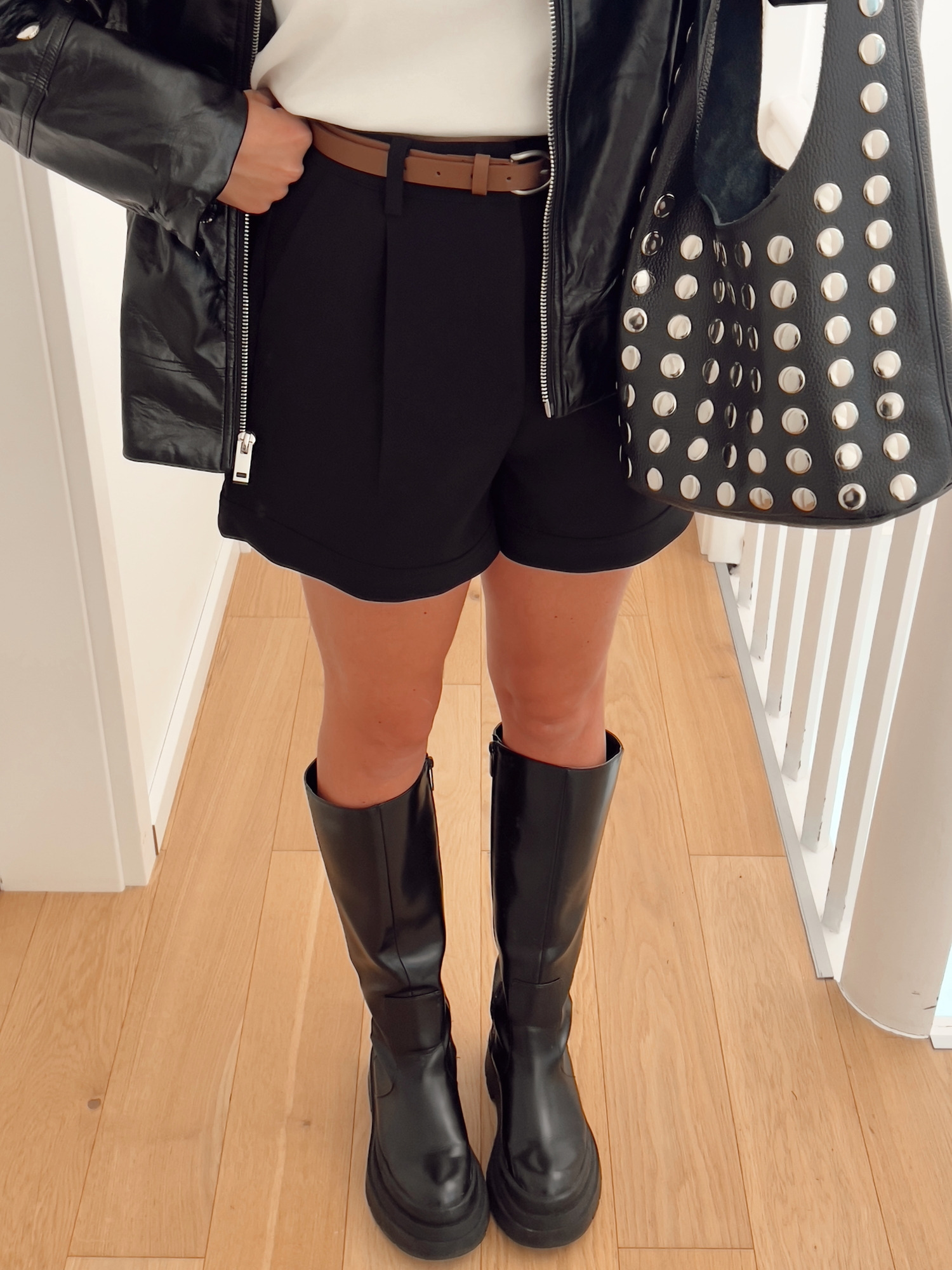 These tailored shorts combine elegance and modernity thanks to their structured lines and meticulous finish. The high waist enhances the silhouette and is accompanied by a slim integrated belt with metal buckle, adding a refined yet practical touch. Front darts add subtle volume and reinforce its tailoring-inspired chic spirit. The straight, slightly loose fit ensures comfort and freedom of movement, while the cuffed hems at the bottom of the legs underline its contemporary style. A versatile piece, perfect for both dressy and chic casual looks.