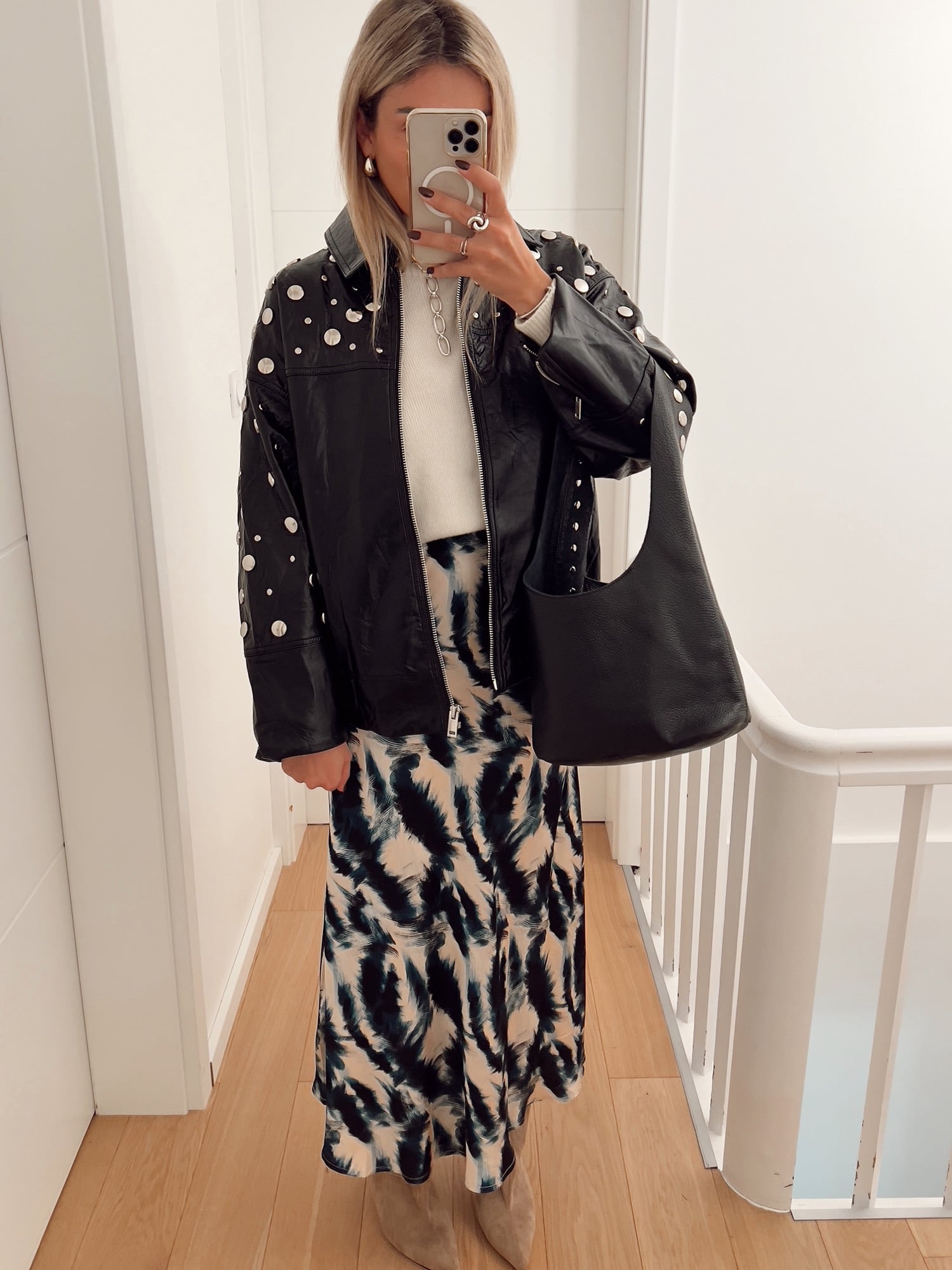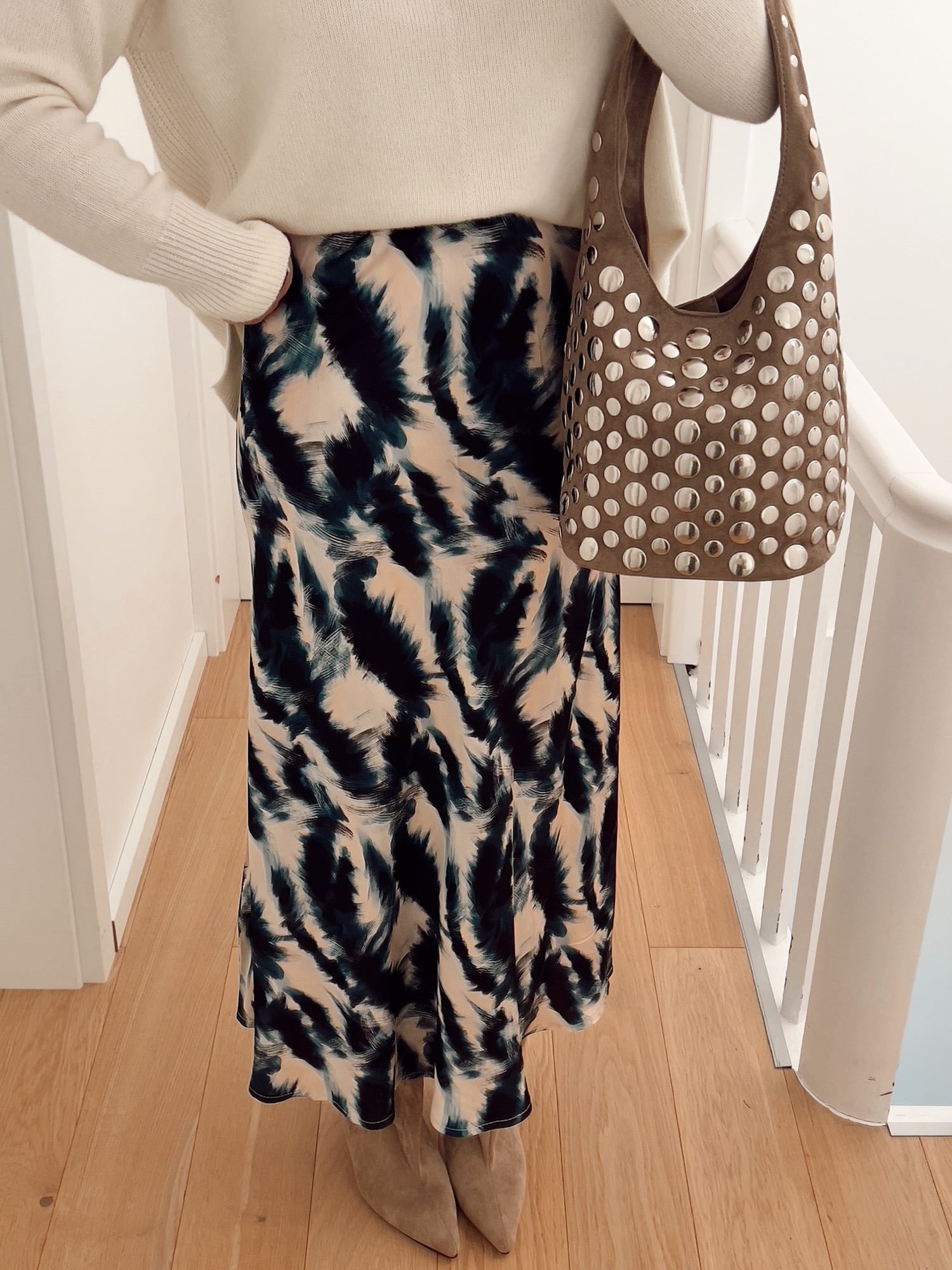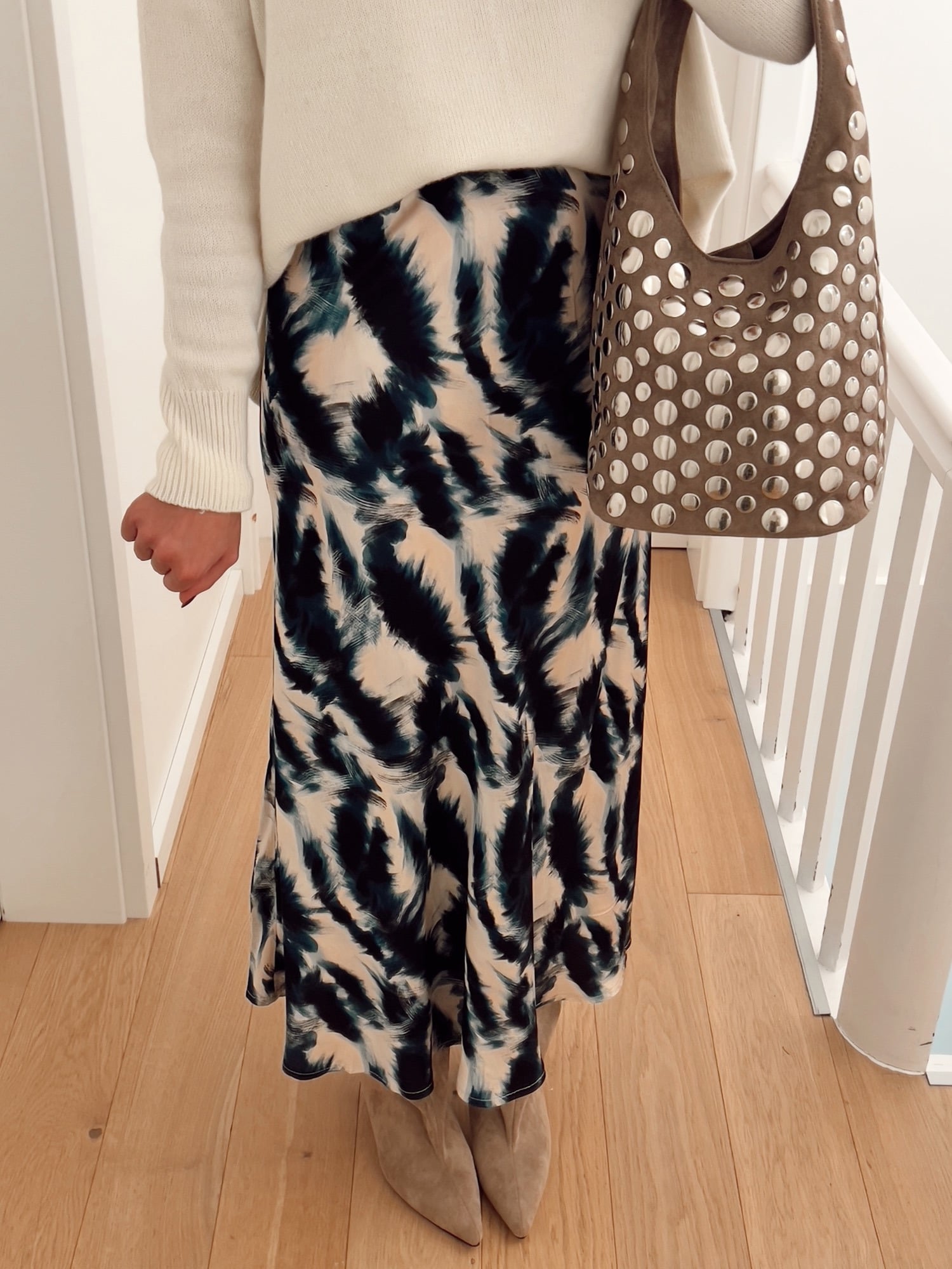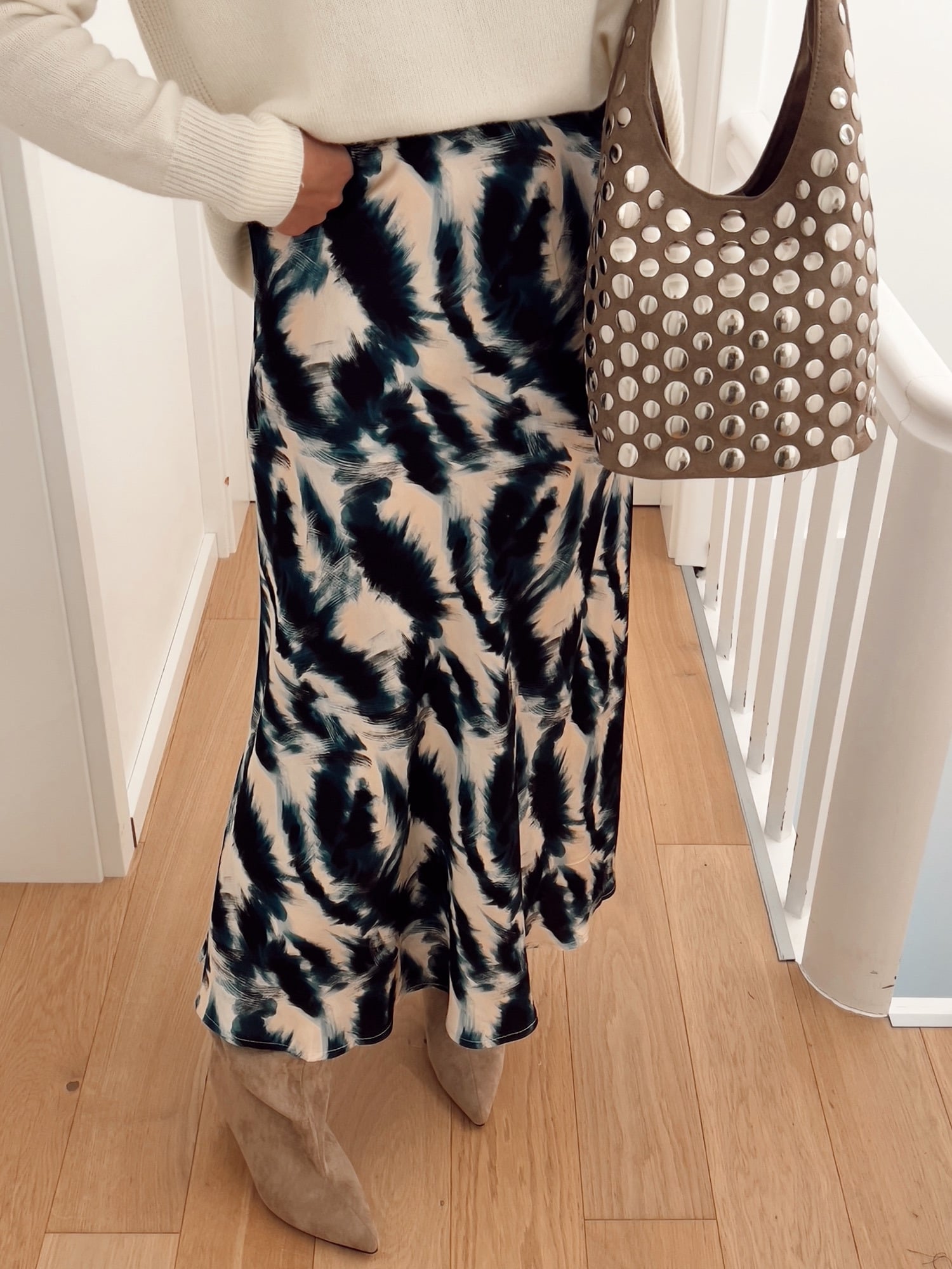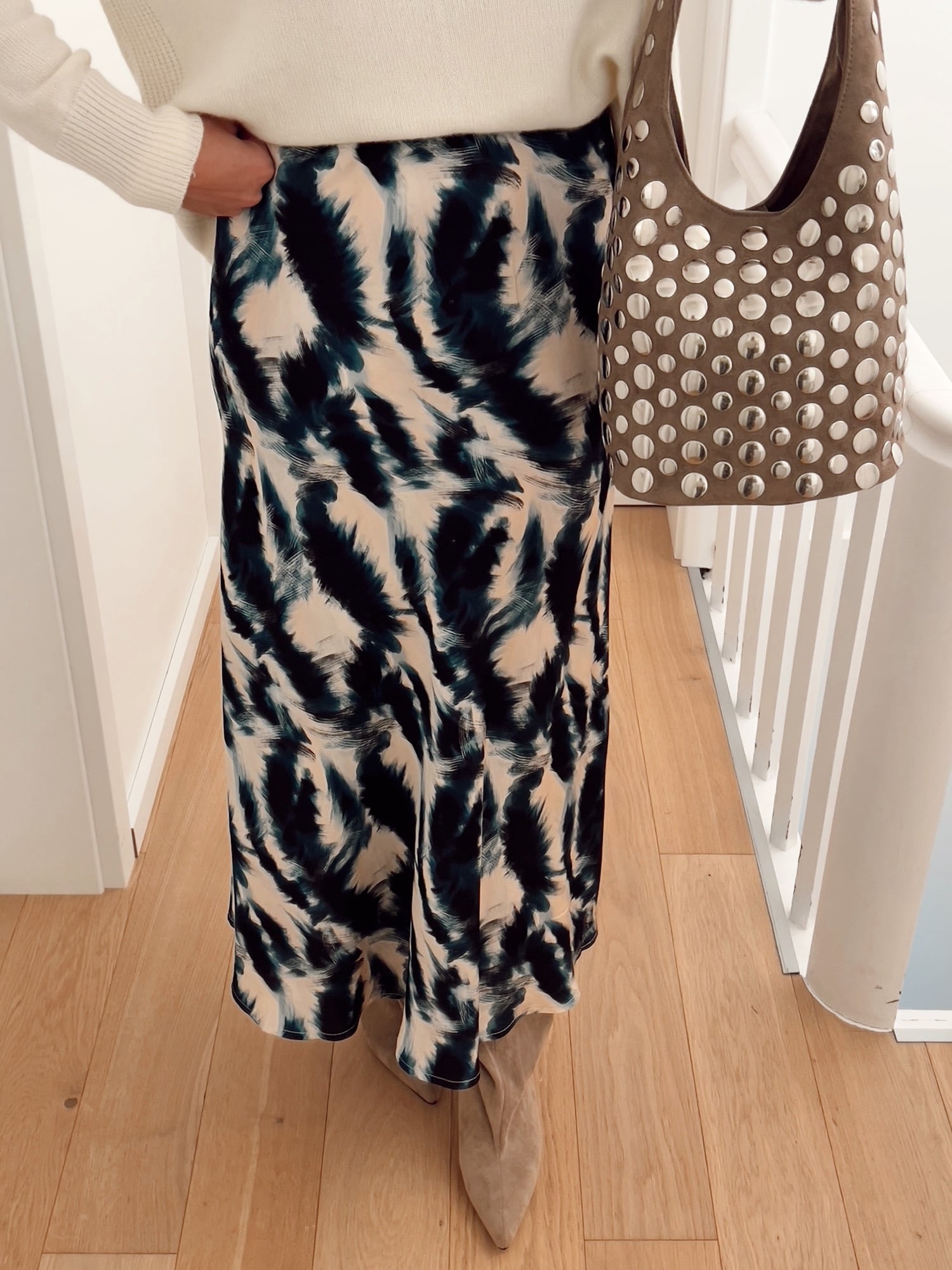 This printed satin long skirt combines fluidity and elegance with a contemporary touch. Its satin fabric delicately catches the light and emphasizes the natural movement of the silhouette. The abstract print adds character and dynamism to the style, perfect for modernizing a classic outfit. Its slightly flared cut ensures comfort and femininity, while its high waist structures the line and elongates the silhouette. Easy to wear, it goes just as well with an oversized sweater for a chic casual look as with an elegant blouse for a dressier look.