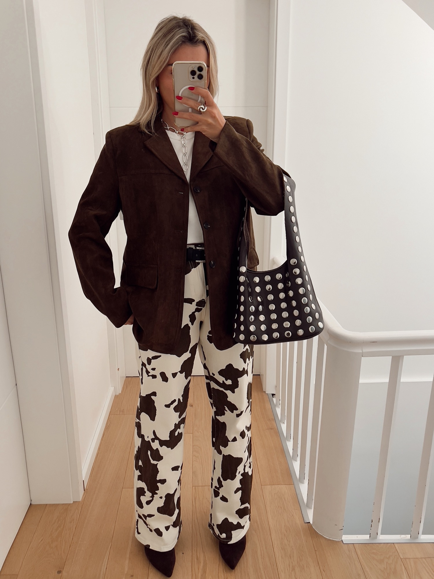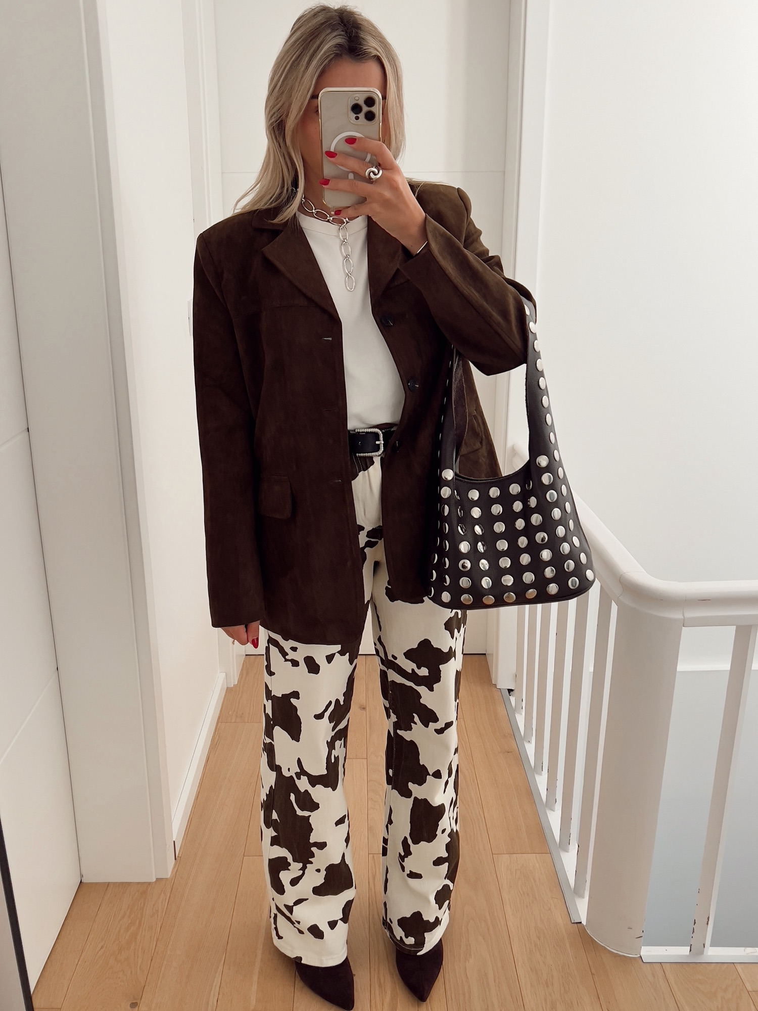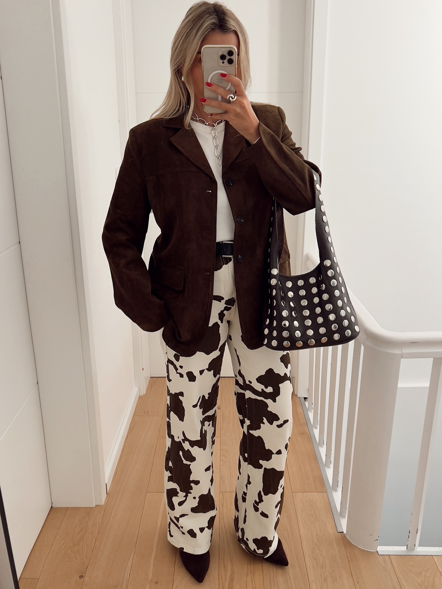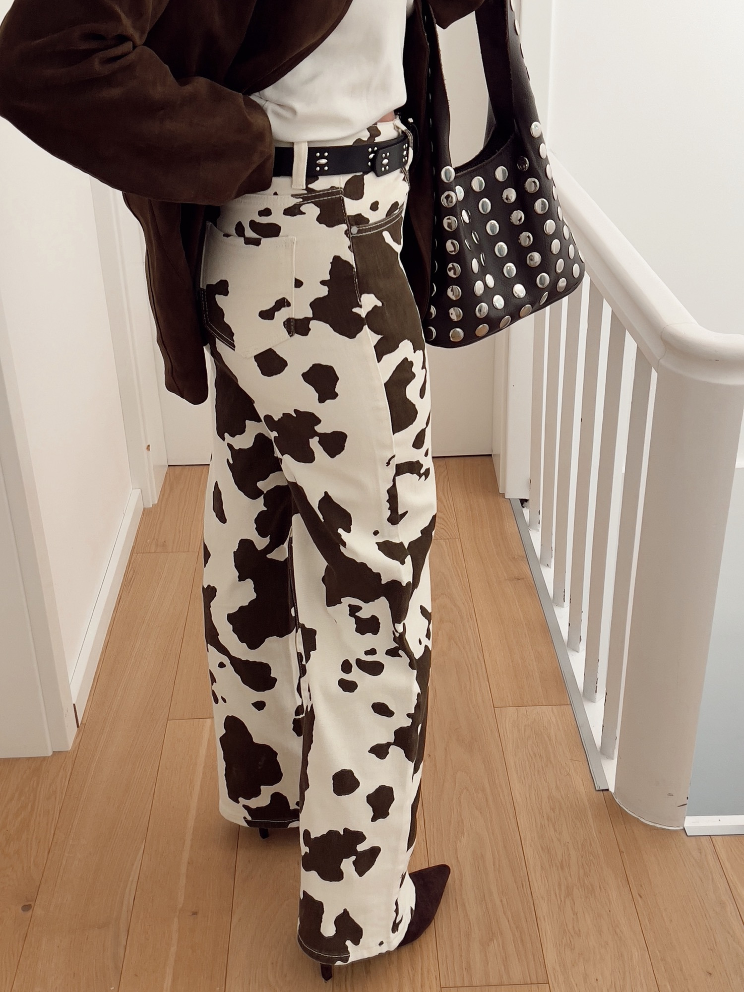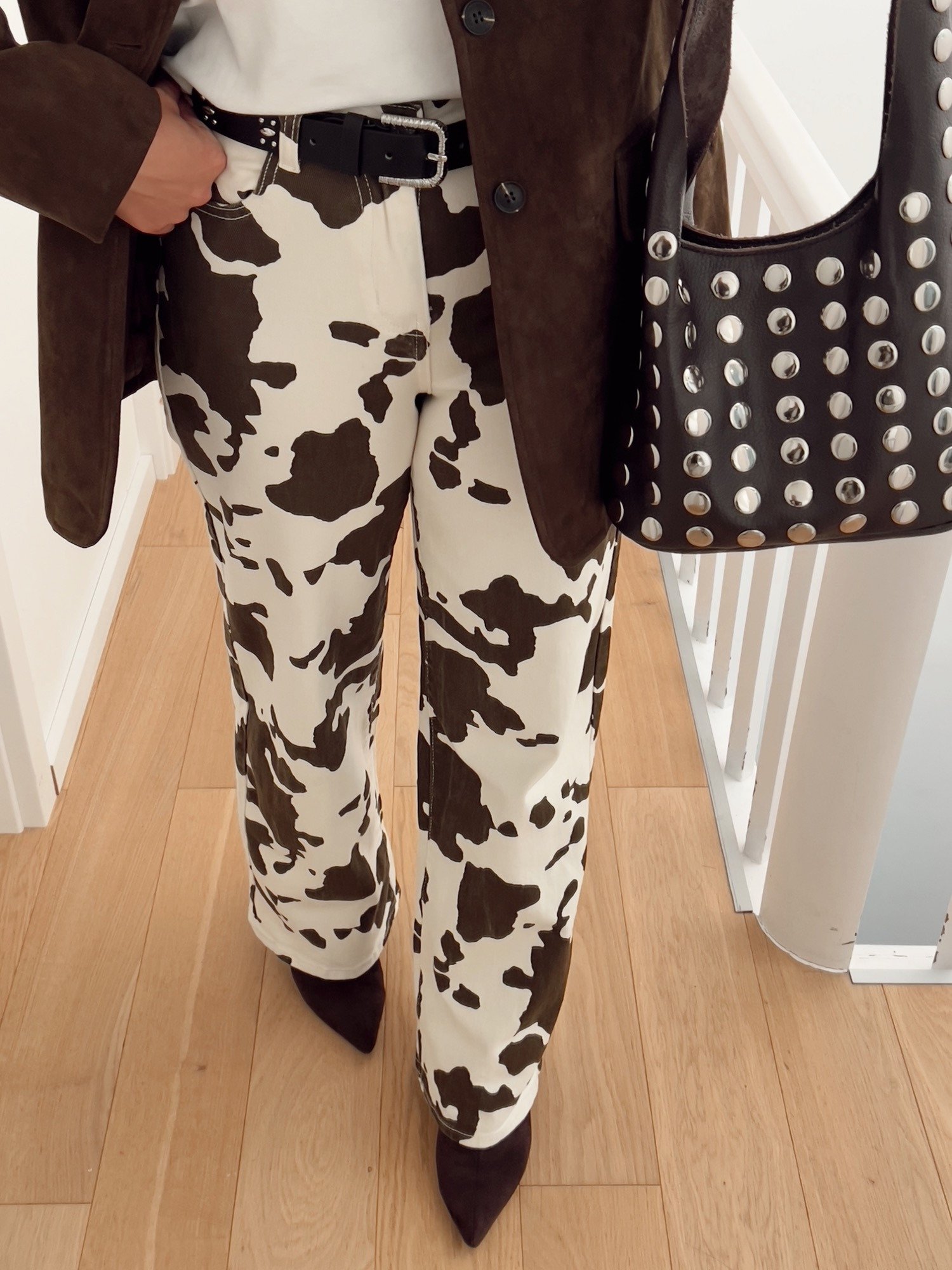 Ce jean wide leg à motif vache est la pièce statement parfaite pour celles qui n’ont pas peur d’oser. Son imprimé audacieux façon cow print attire tous les regards tout en restant facile à styliser avec des basiques unis. La coupe taille haute et la jambe large allongent la silhouette et apportent une touche rétro ultra tendance. Confortable et original, il mixe l’inspiration western et le style street avec brio. À porter en journée comme en soirée pour un look affirmé et mode.