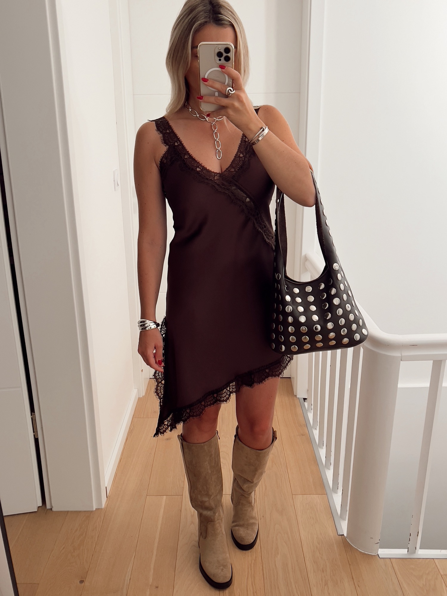 Cette robe courte satinée en dentelle joue la carte de l’élégance sensuelle avec une touche moderne. Sa coupe asymétrique et sa finition en dentelle délicate subliment la silhouette tout en douceur. On adore son tissu satiné qui capte la lumière et apporte un effet soyeux irrésistible. Les bretelles fines et le décolleté en V ajoutent une allure féminine et délicate, parfaite pour les soirées ou les looks de jour un peu plus sophistiqués. Une pièce à la fois intemporelle et audacieuse.