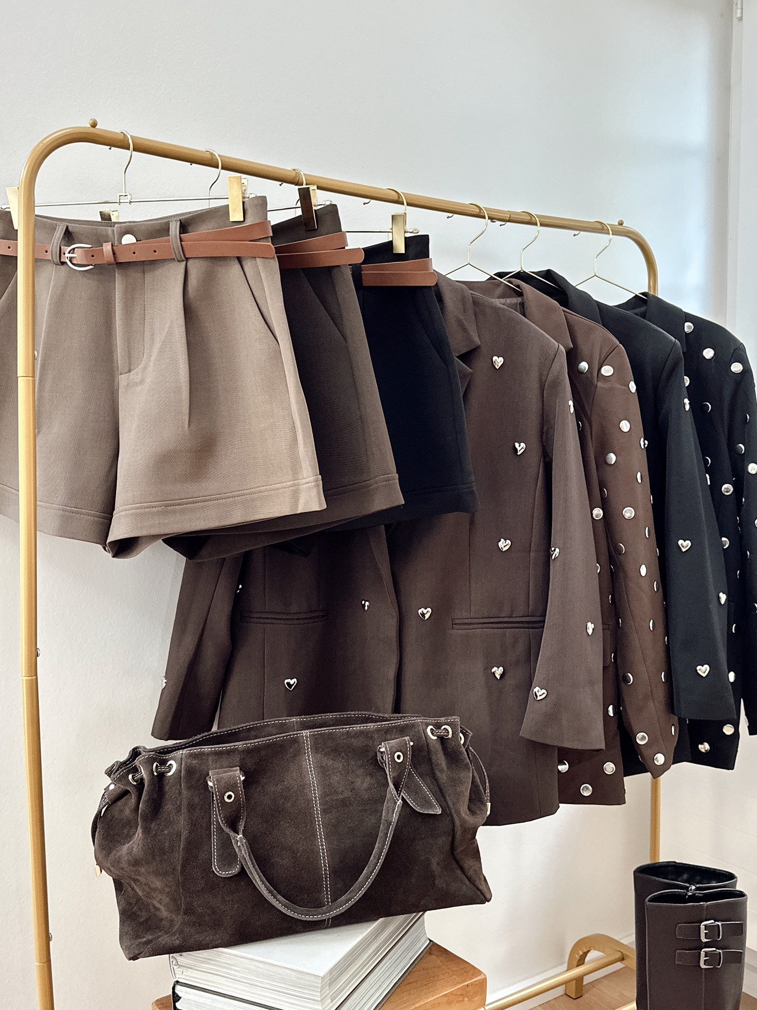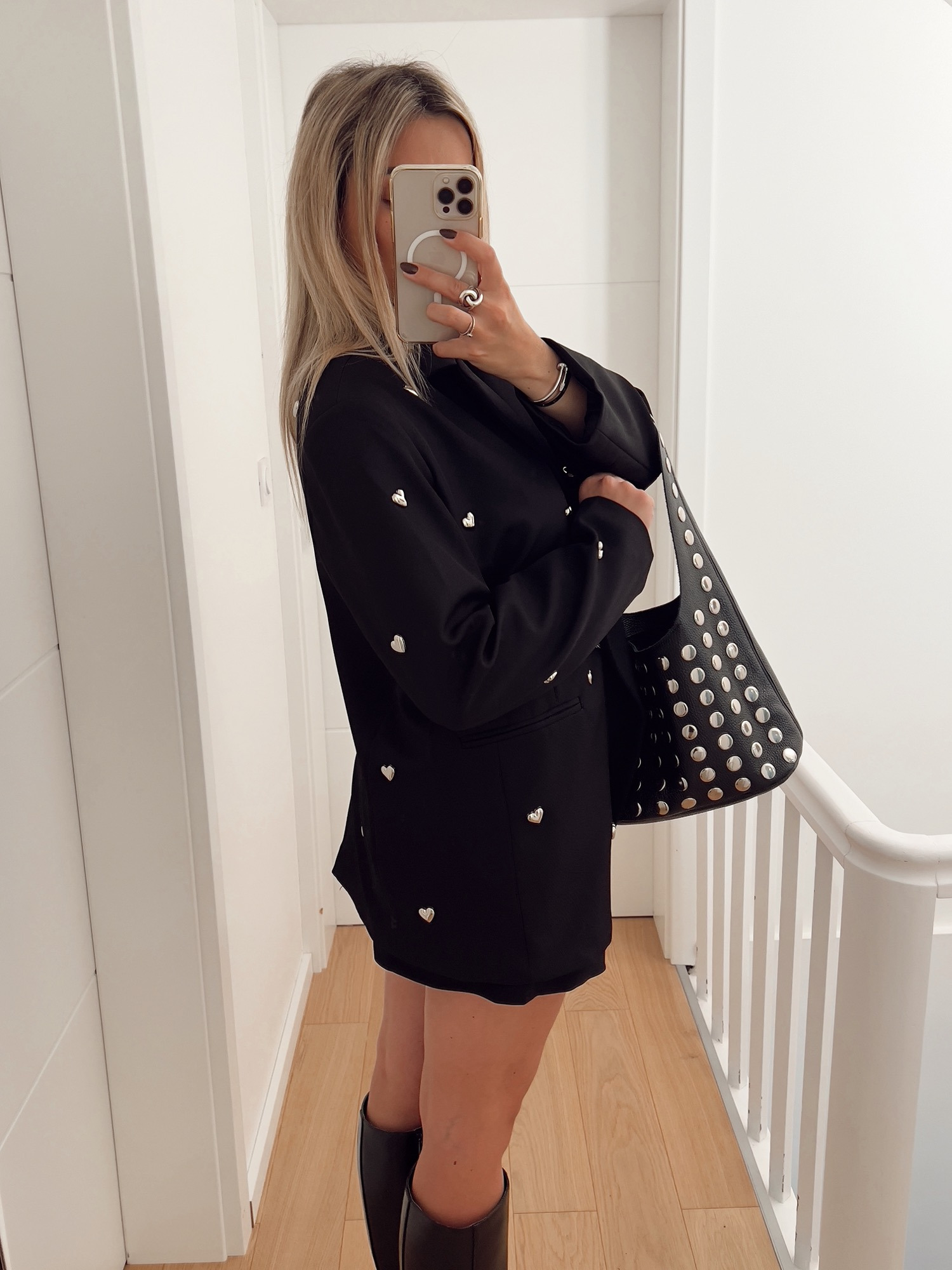 Ce blazer oversize décoré de cœurs métalliques revisite le classique tailleur avec une touche fantaisie et romantique. Sa coupe ample et allongée lui confère une allure moderne et décontractée, idéale pour être porté aussi bien sur une robe que sur un pantalon. Les cœurs argentés appliqués en all-over apportent de l’originalité et un effet lumineux qui dynamise la silhouette. Doté de revers élégants et de poches à rabat, il conserve l’esprit tailoring tout en s’amusant des détails. Parfait pour celles qui aiment mixer chic et originalité, c’est une pièce statement qui attire immédiatement l’œil.
